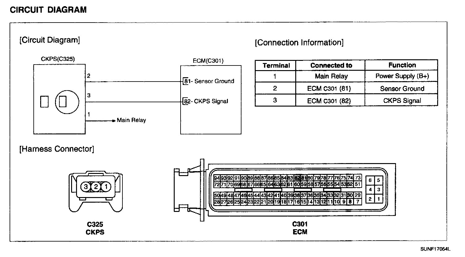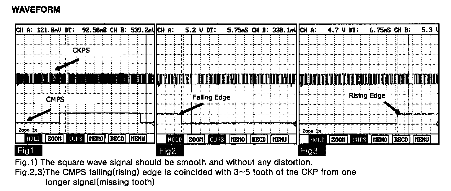 Crankshaft Position Sensor (CKPS) detects the crankshaft position and is one of the most important sensors of the engine control system. If there is no CKPS signal input, fuel is not supplied. That is, vehicle can't run without CKPS signal. This sensor is installed on transaxle housing and generates alternating current by magnetic flux field which is made by the sensor and the target wheel when engine runs. The target wheel consists of 58 slots and 2 missing slots on 360° CA (Crank Angle).