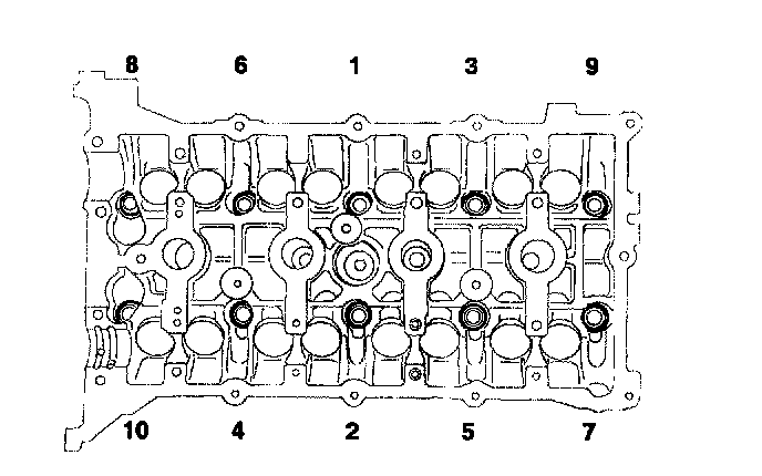 Tighten the 10 cylinder head bolts and plate washers, in several passes, in the sequence shown.