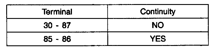 4. Apply 12 V to terminal 85 and ground to terminal 86. Check for continuity between terminals 30 and 87.