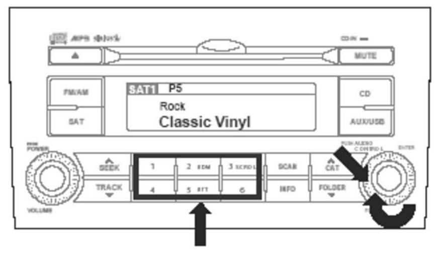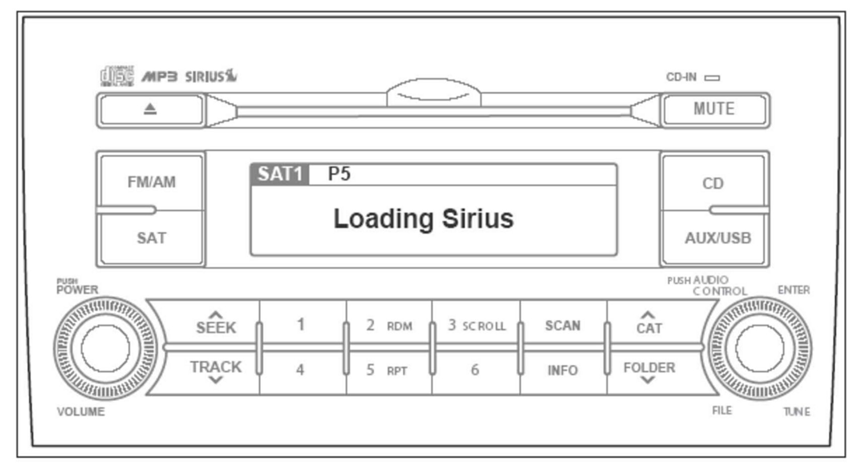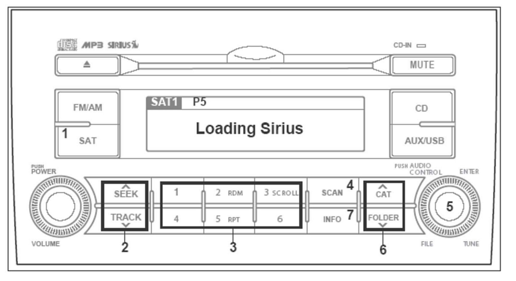 1. SAT/SIRIUS button: Press this button with the audio unit ON to access Sirius Satellite Radio. Pressing this button repeatedly will cycle through SAT1/SAT2/SAT3 bands.