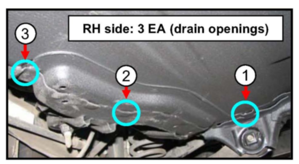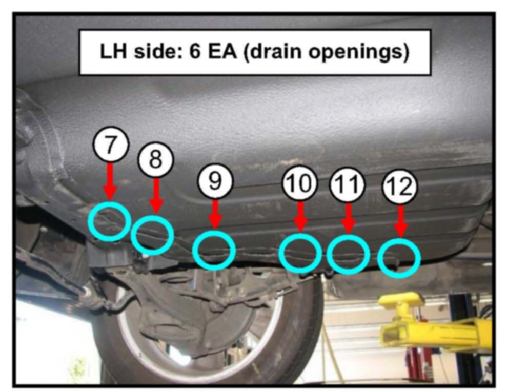 16. Spray cavity wax through the twelve (12) holes indicated in the photo above. Three (3) cavity wax aerosol cans are required to perform this task per vehicle, so use one (1) can of cavity wax per four (4) openings.
