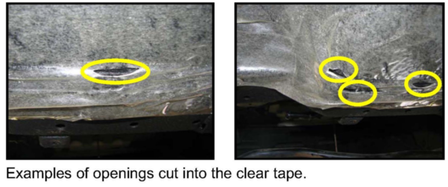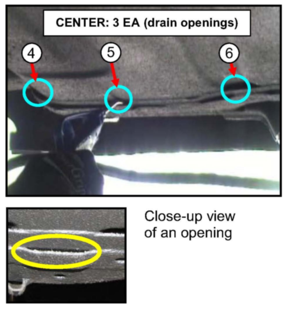 Before spraying cavity wax, block the (LH, RH and Center) drain openings (used for blowing out foreign materials and debris in the previous procedure) as shown in the photo using the tape supplied in the tool kit. This is to avoid wax from flowing down through the holes while spraying wax.