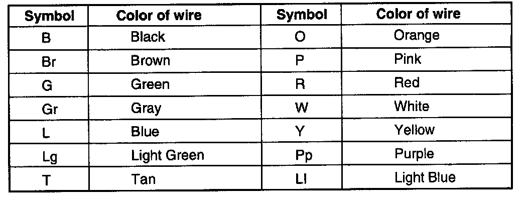 The given abbreviations are used to identify wire colors in the circuit schematics.