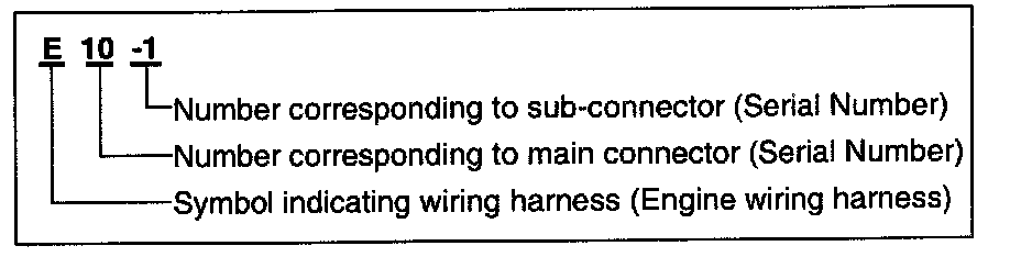 A connector identification symbol consists of a wiring harness location classification symbol corresponding to a wiring harness location and number corresponding to the connector.