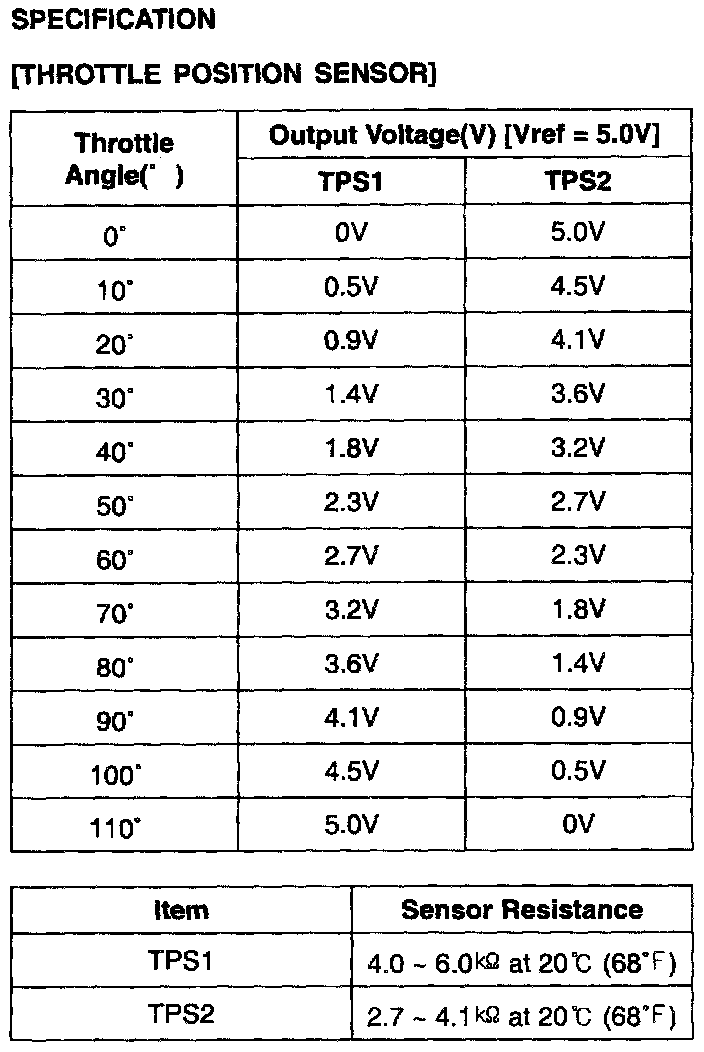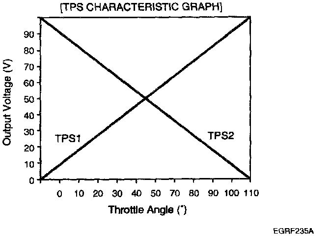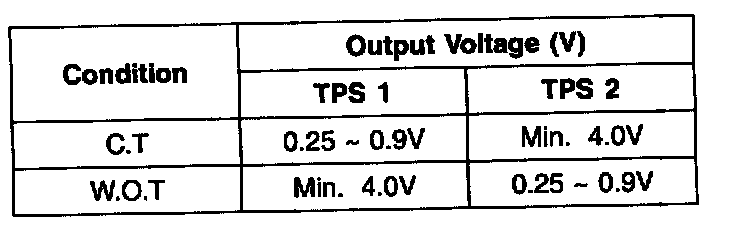 2. Start engine and check output voltages of TPS 1 and 2 at C.T and W.O.T.