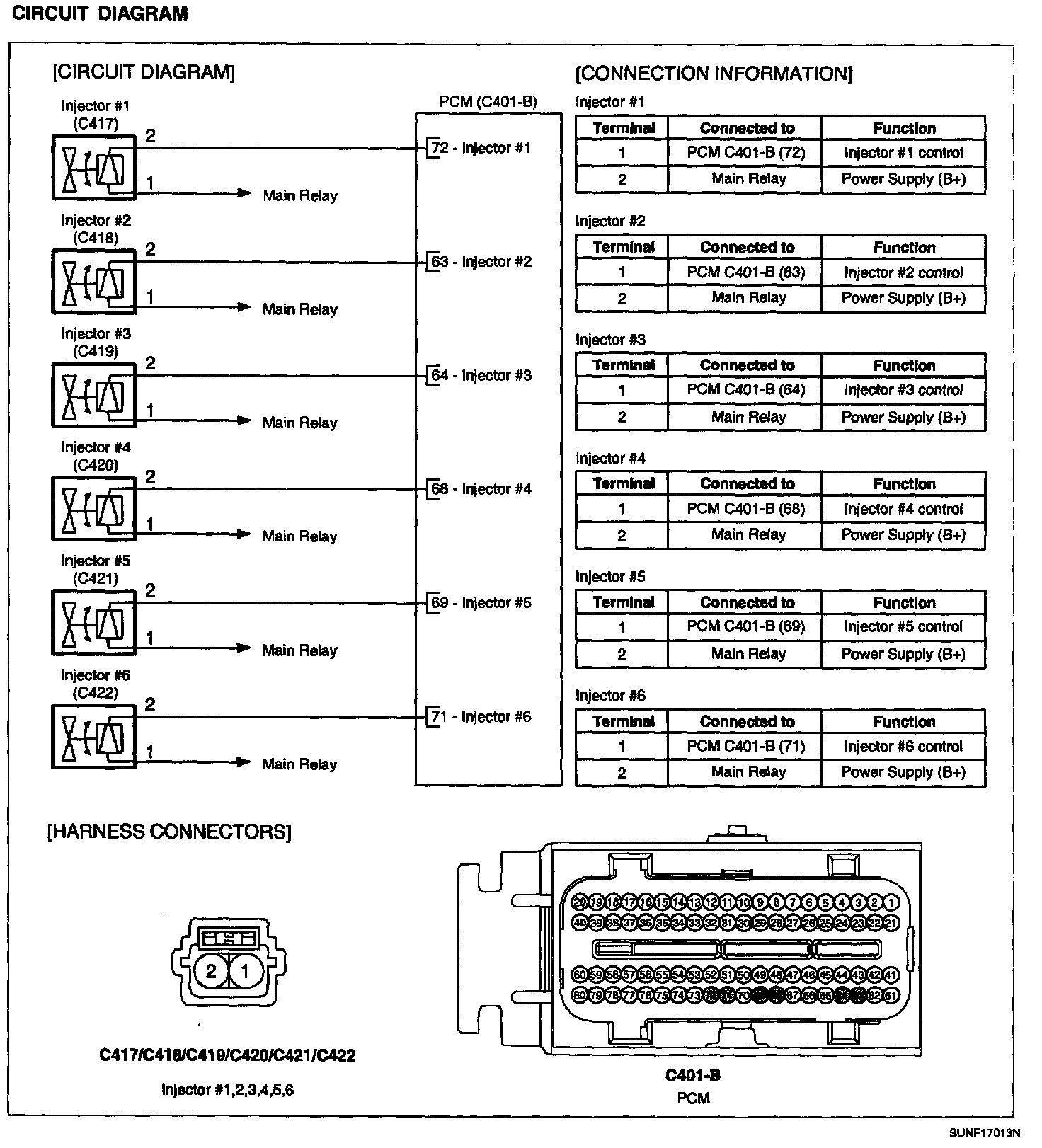 Based on information from various sensors, the PCM measures the fuel injection amount. The fuel injector is a solenoid-operated valve and the fuel injection amount is controlled by length of time that the fuel injector is held open. The PCM controls each injector by grounding the control circuit. When the PCM energizes the injector by grounding the control circuit, the circuit voltage should be low (theoretically 0 V) and the fuel is injected. When the PCM de-energizes the injector by opening control circuit, the fuel injector is closed and circuit voltage should momentarily peak.
