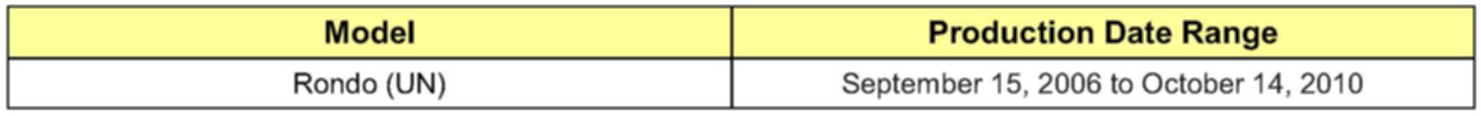 This Service Campaign provides information relating to Rondo (UN) vehicles built from September 15, 2006 to October 14, 2010 and provides a procedure to apply additional anticorrosion protection to the rear cross member. Owners of 2007-2010MY Kia Rondo (UN) vehicles currently registered in the 21 states which are known to use heavy amounts of road salt are being notified to schedule an appointment with the nearest Kia dealer. The 21 states are: CT, DC, DE, IA, IL, IN, MA, MD, ME, MI, MN, MO, NH, NJ, NY, OH, PA, RI, VT, WI WV.
