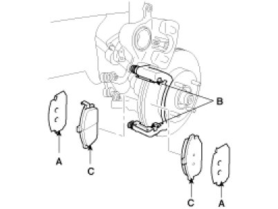 2. Remove the pad shims (A), pad retainers (B) and pads (C).