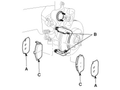 3. Install the brake pads (B) and pad shims (A) correctly. Install the pad with the wear indicator (C) on the inside.