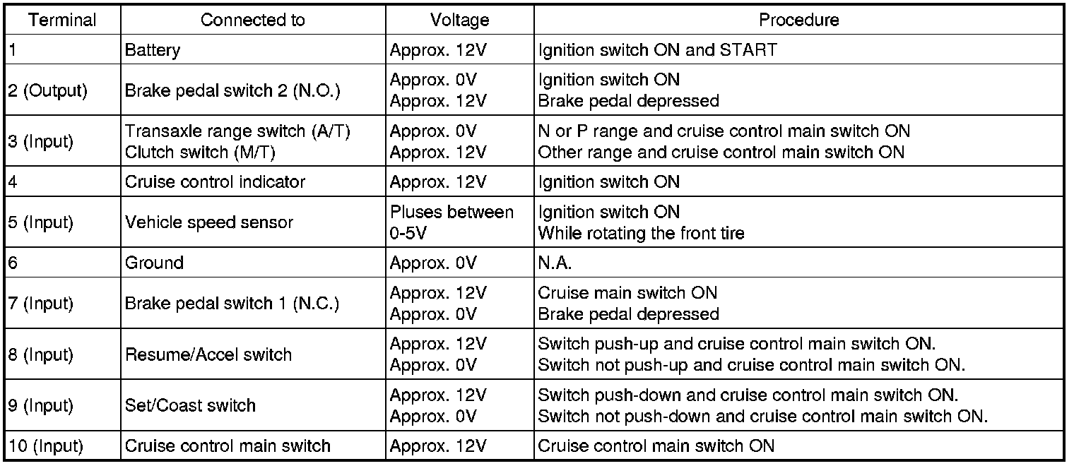 1. Connect a voltmeter between cruise control unit terminals and ground. (Connector Q01 connected)