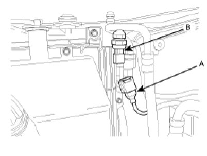 3. Disconnect A/C pressure transducer connector (A) and then remove the A/C pressure transducer (B).