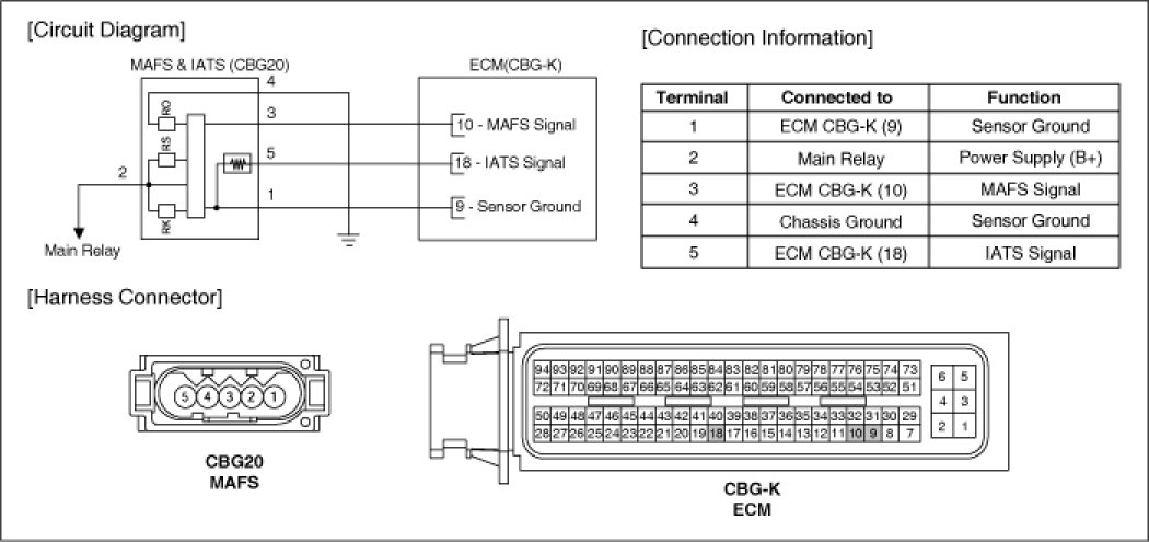 Mass Air Flow Sensor (MAFS) is a hot-film type sensor and is located in between the air cleaner and the throttle body. It consists of a tube, a sensor assembly and honeycomb cell and detects intake air quantity flowing into the intake manifold. Air flows from the air cleaner assembly through the honeycomb cell and over the hot film element. At this time, heat transfer is generated by convection and this sensor loses its energy. This sensor detects the mass air flow by using the energy loss and transfers the information to the ECM by voltage. The ECM calculates fuel quantity and ignition timing.