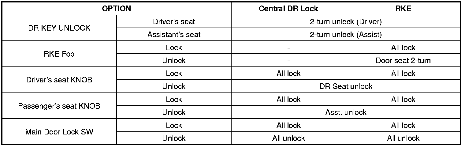(1) When the Driver Door unlocked with driver's seat KEY CYLINDER or RKE, only Driver Door is unlocked.