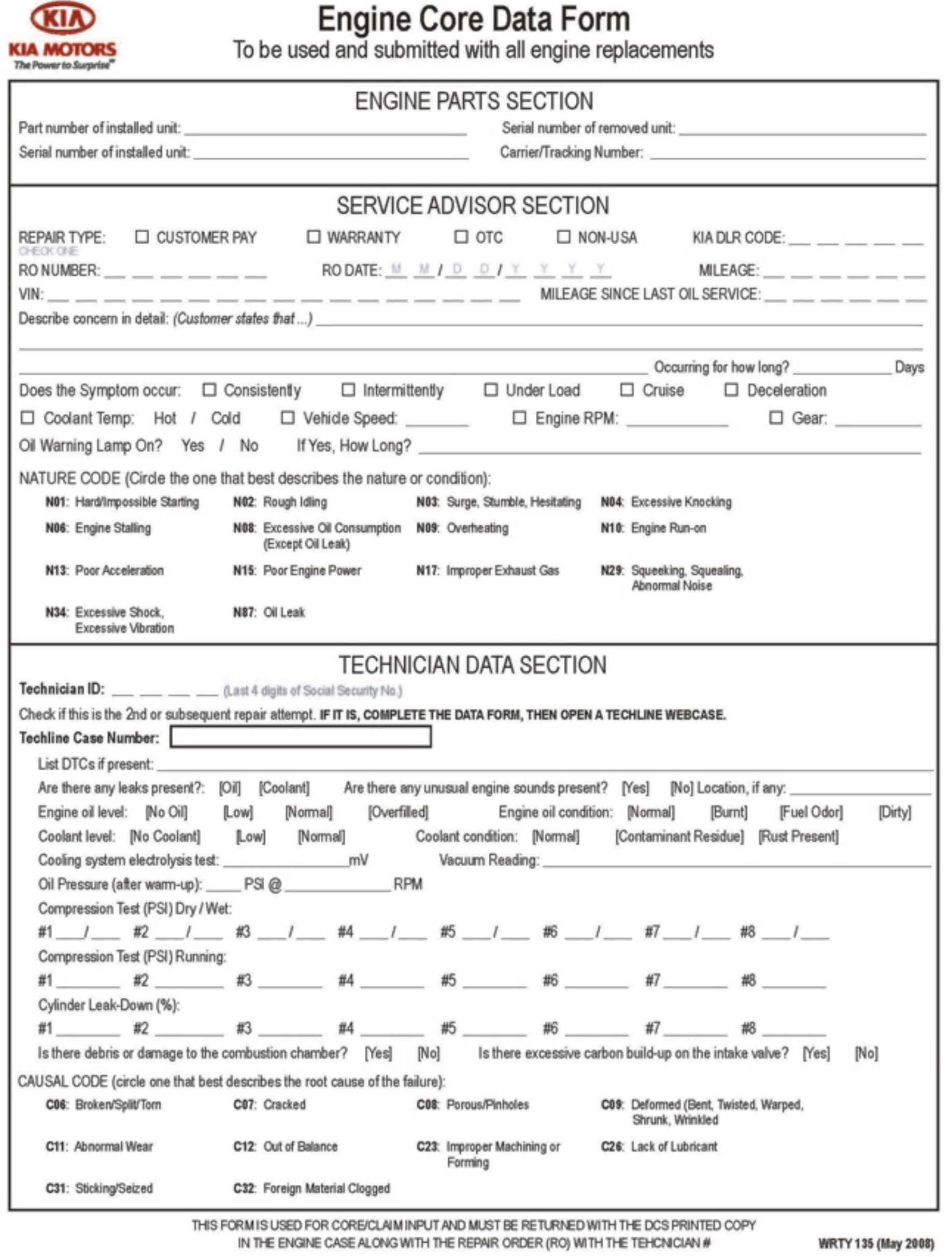 1. Open a repair order and with the customer, complete the top section of the Engine Core Data Form (WRTY 135 May 2008), available on KGIS or copy the form shown above)