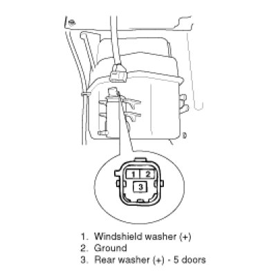 2. Connect positive (+) and negative (-) battery cables to terminals 1 and 2 respectively to see that the washer motor runs and water sprays from the front nozzles.