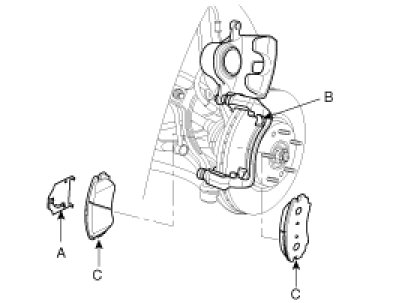 3. Remove pad shim(A), pad retainer(B) and pad assembly(C) in the caliper bracket.