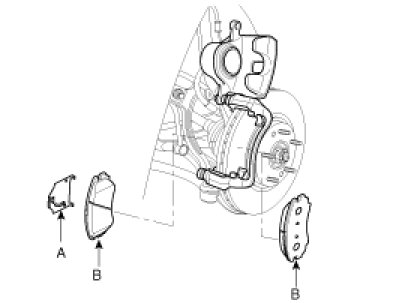 2. Install pad shims(A) and the brake pads(B) with the wear indicator on the inside.