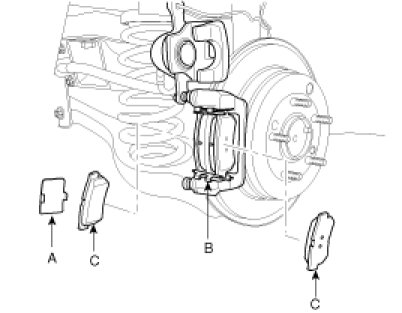 3. Remove pad shim (A), pad retainer (B) and pad assembly (C) in the caliper bracket.