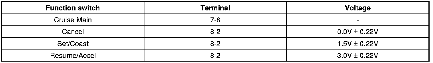 2. Measure voltage between terminals on the harness side connector when each function switch is ON (switch is depressed).