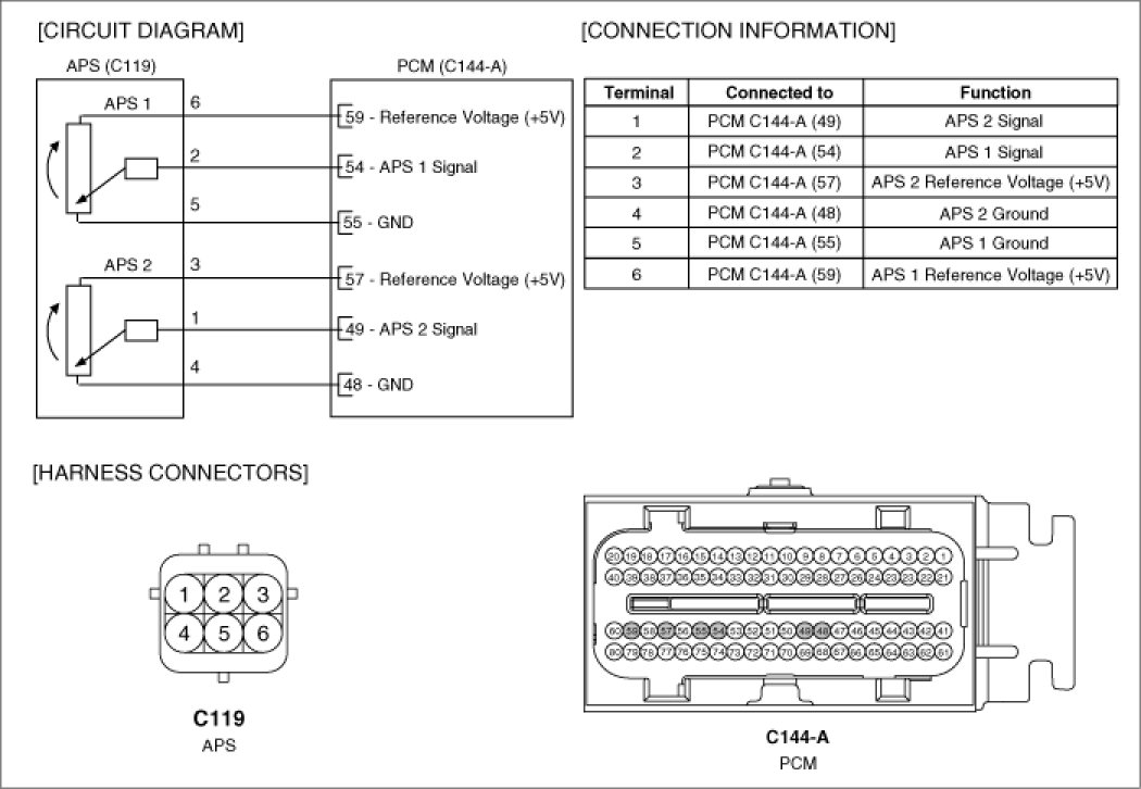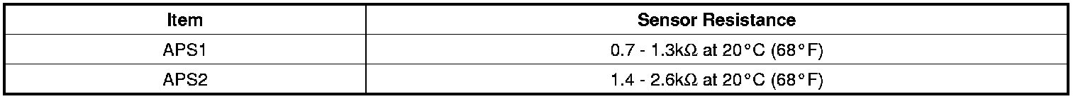 Accelerator Position Sensor (APS) is installed on the accelerator pedal module and detects the rotation angle of the accelerator pedal. The APS is one of the most important sensors in engine control system, so it consists of the two sensors which adapt individual sensor power and ground line. The second sensor monitors the first sensor and its output voltage is half of the first one. If the ratio of the sensor 1 and 2 is out of the range (approximately 1/2), the diagnostic system judges that it is abnormal.
