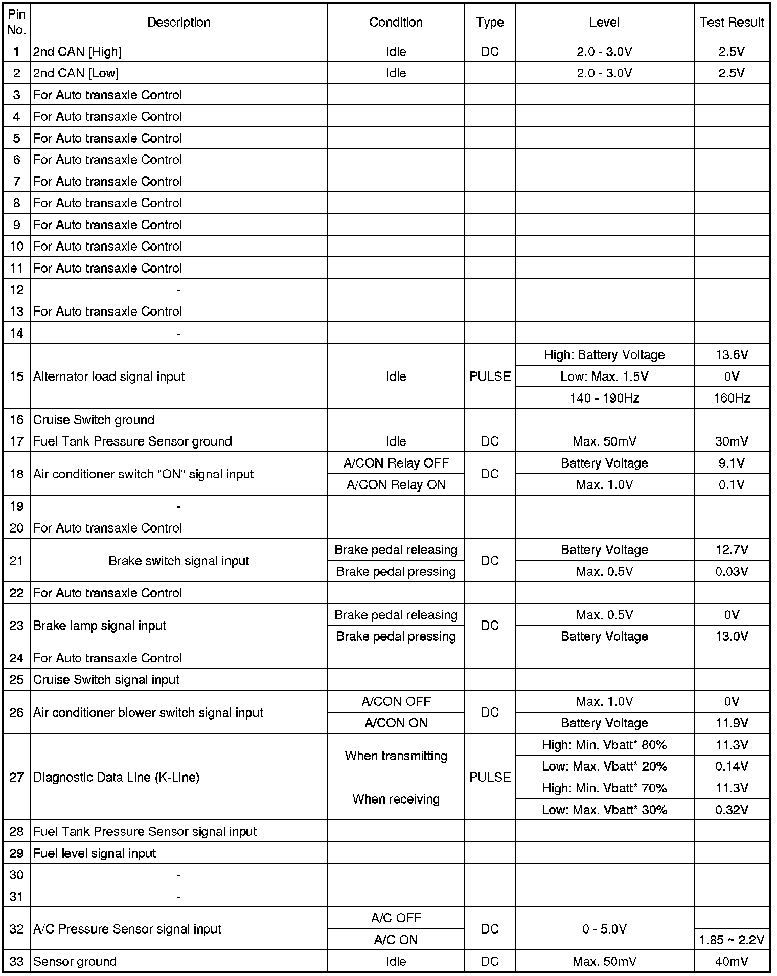 Pinout Values and Diagnostic Parameters