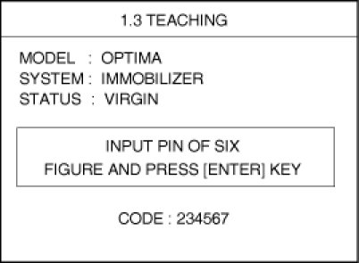 The procedure starts with an PCM(ECM) request for vehicle specific data (PIN code: 6digits) from the tester. The "virgin" PCM(ECM) stores the vehicle specific data and the key teaching can be started. The "learnt" PCM(ECM) compares the vehicle specific data from the tester with the stored data. If the data are correct, the teaching can proceed.