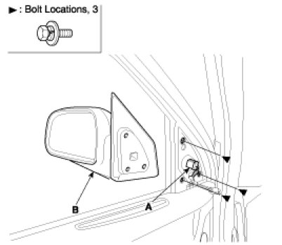 2. After disconnecting the connector (A), remove the outside rear view mirror (B).