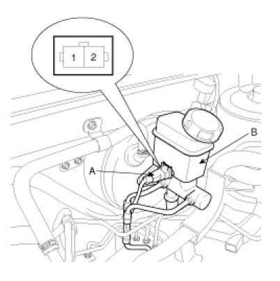 Remove the connector(A) from the switch located at the brake fluid reservoir(B).