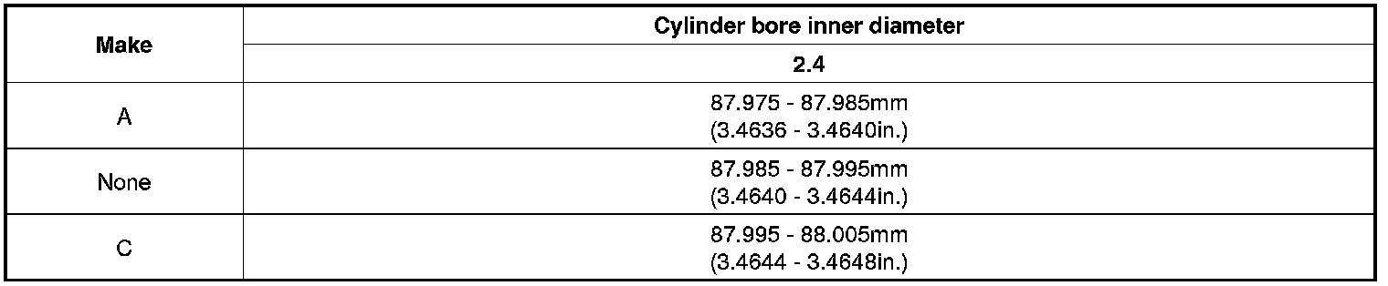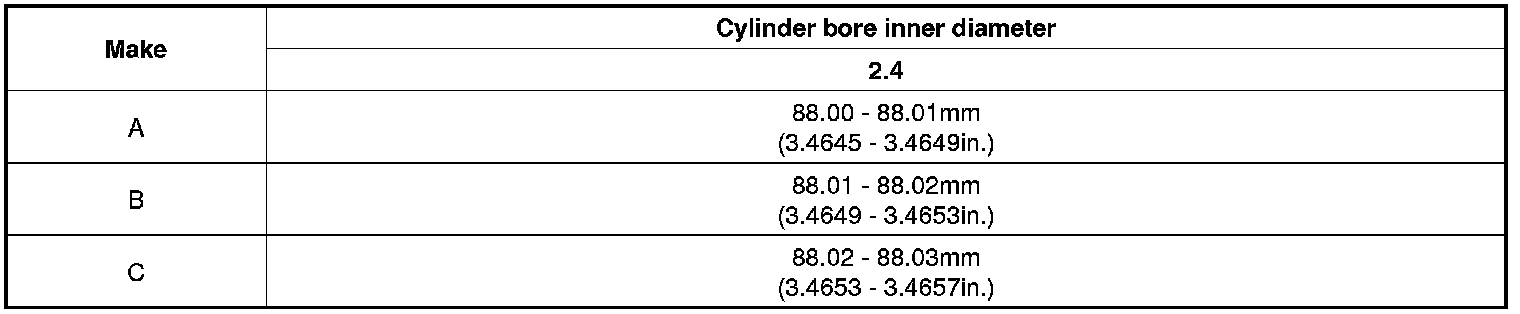 New bore size = piston O.D + 0.015 to 0.035mm (0.0006 to 0.0014in) (clearance between piston and cylinder) - 0.01mm (0.0004in) (honing margin.)