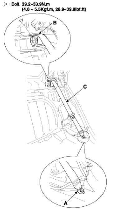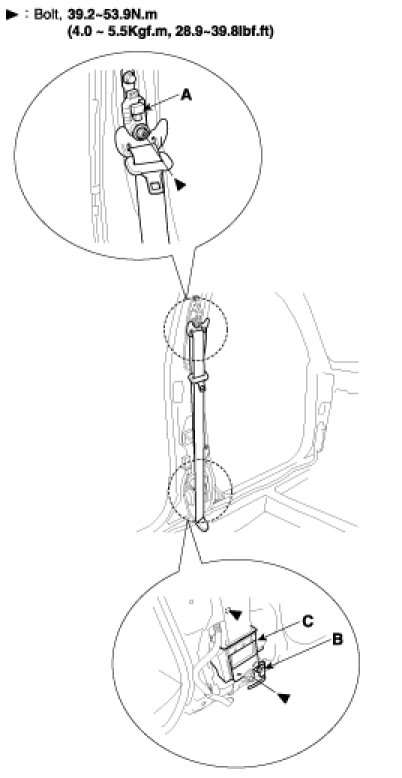4. After loosening the retractor (C) mounting bolt, remove the rear seat belt (B).