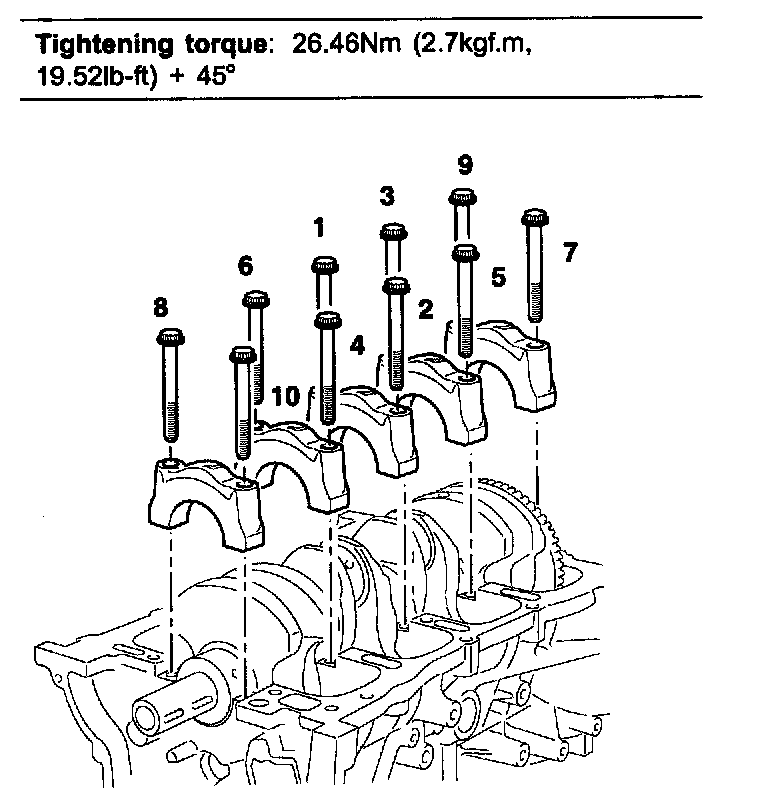 Retighten the bearing cap bolts by 45° in the numerical order shown.