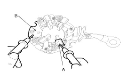 1. Check that there is no continuity between the (+) brush holder (A) and (-) brush holder (B). If there is no continuity, replace the brush holder assembly.
