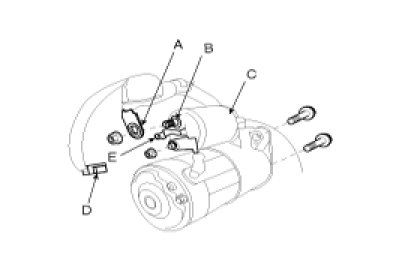 2. Disconnect the starter cable (A) from the B terminal (B) on the solenoid (C), then disconnect the connector (D) from the S terminal (E).