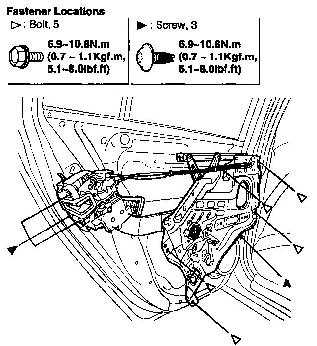 3. After loosening the door module mounting bolts, remove the door module (A).