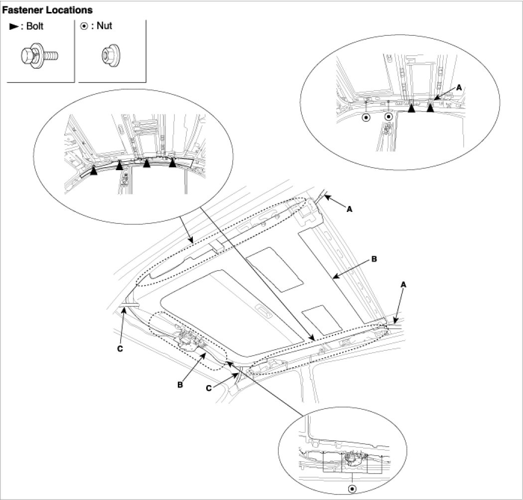 4. After loosening the mounting bolts and nuts, remove the sunroof assembly (B).