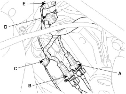(4) Disconnect the injection harness connector(A), the No.2 VIS(Variable Induction System) connector(B), the No.1/No.2 OCV(Oil Control Valve) connectors(C,D) and the OTS(Oil Temperature Sensor) connector(E).
