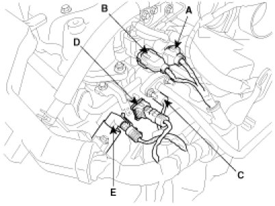 (1) Disconnect the No.1/No.2 knock sensor connectors(A,B), the oil pressure switch connector(C), the ignition coil harness(D) and the No.1 VIS(Variable Induction System) connector(E).
