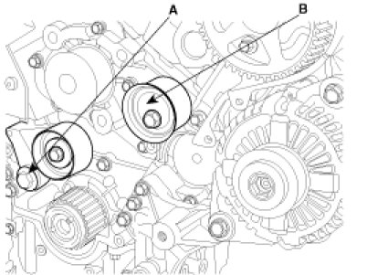 2. Install the tensioner arm assembly(A) and the idler(B).
