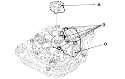2. Check that there is no continuity between the slip rings and the rotor (B) or rotor shaft (C).