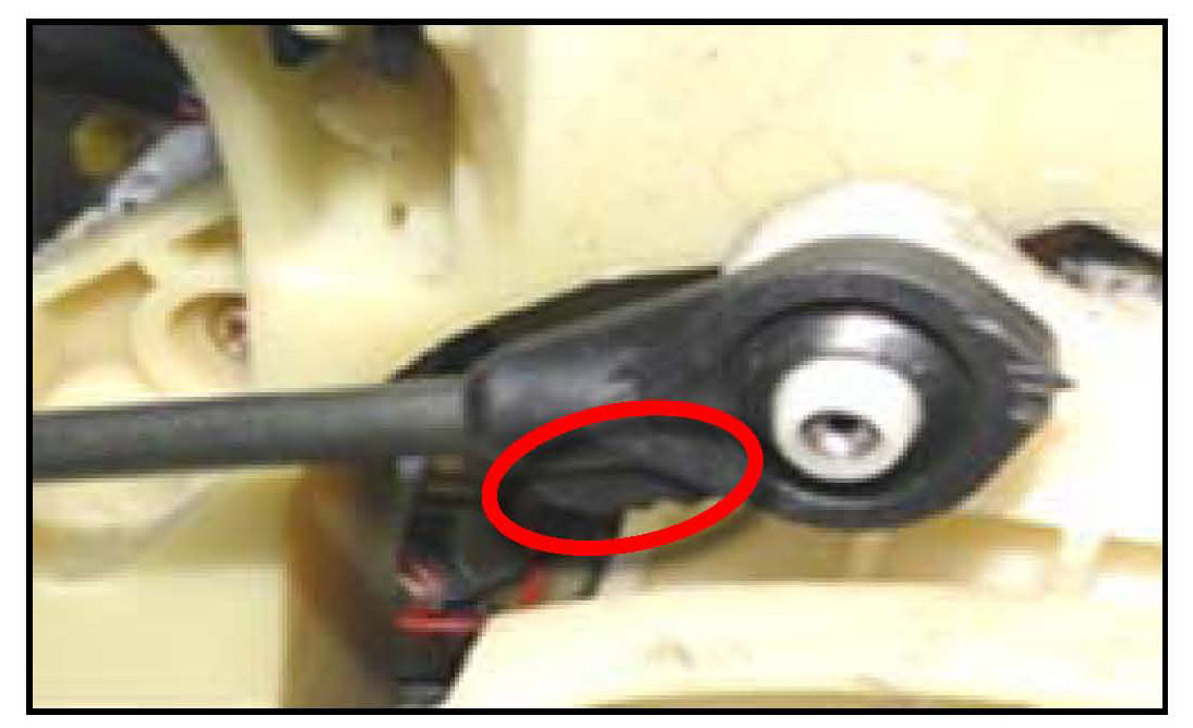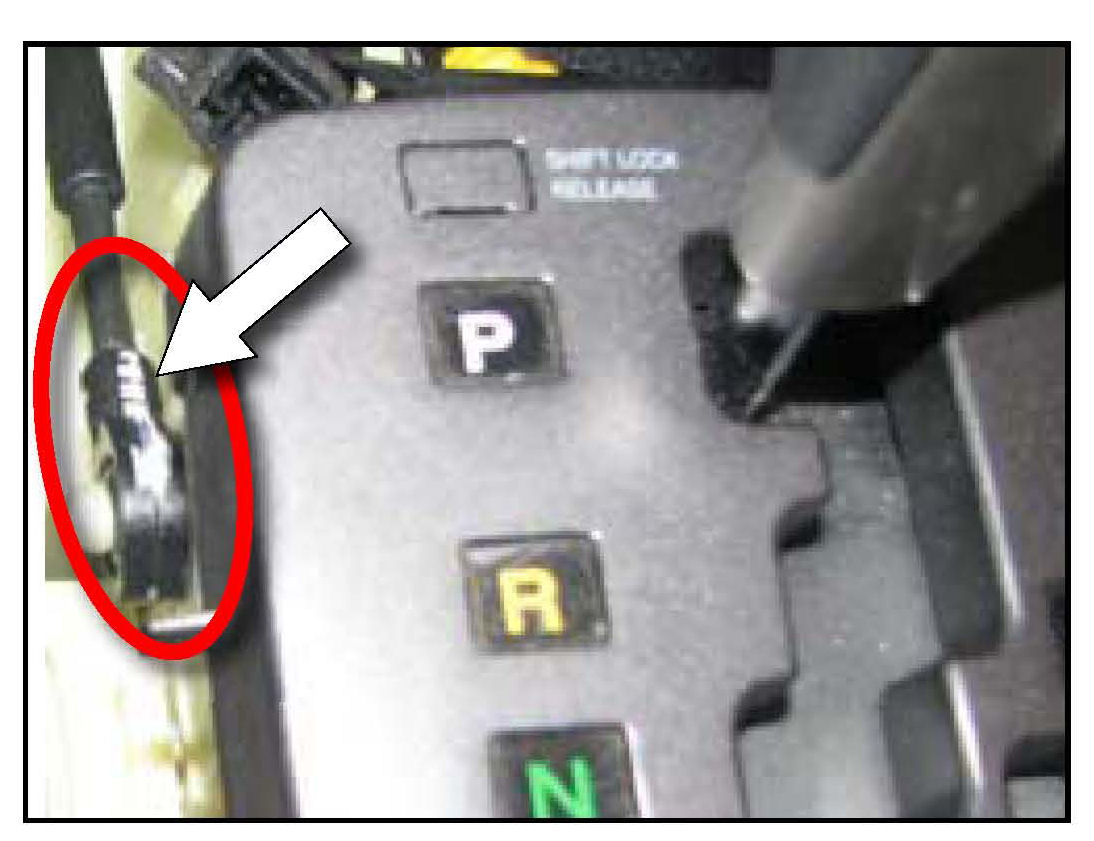 2. Check that the A/T shift cable is installed correctly (arrow). It the cable is found to be installed correctly (saw-edged projections facing up) no further action is required. Reinstall center console cover. It installed incorrectly proceed with repair procedure beginning at Step 3.