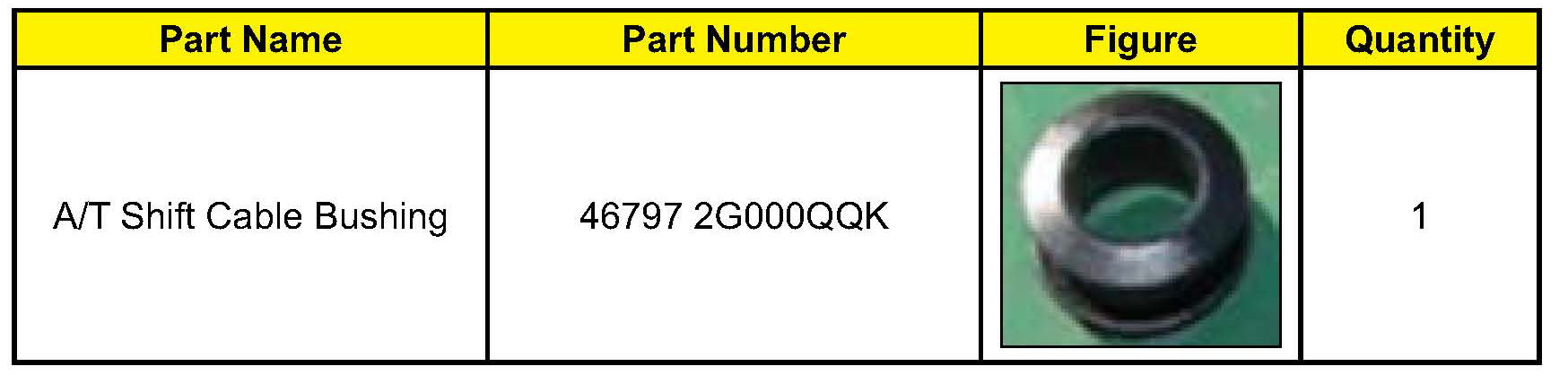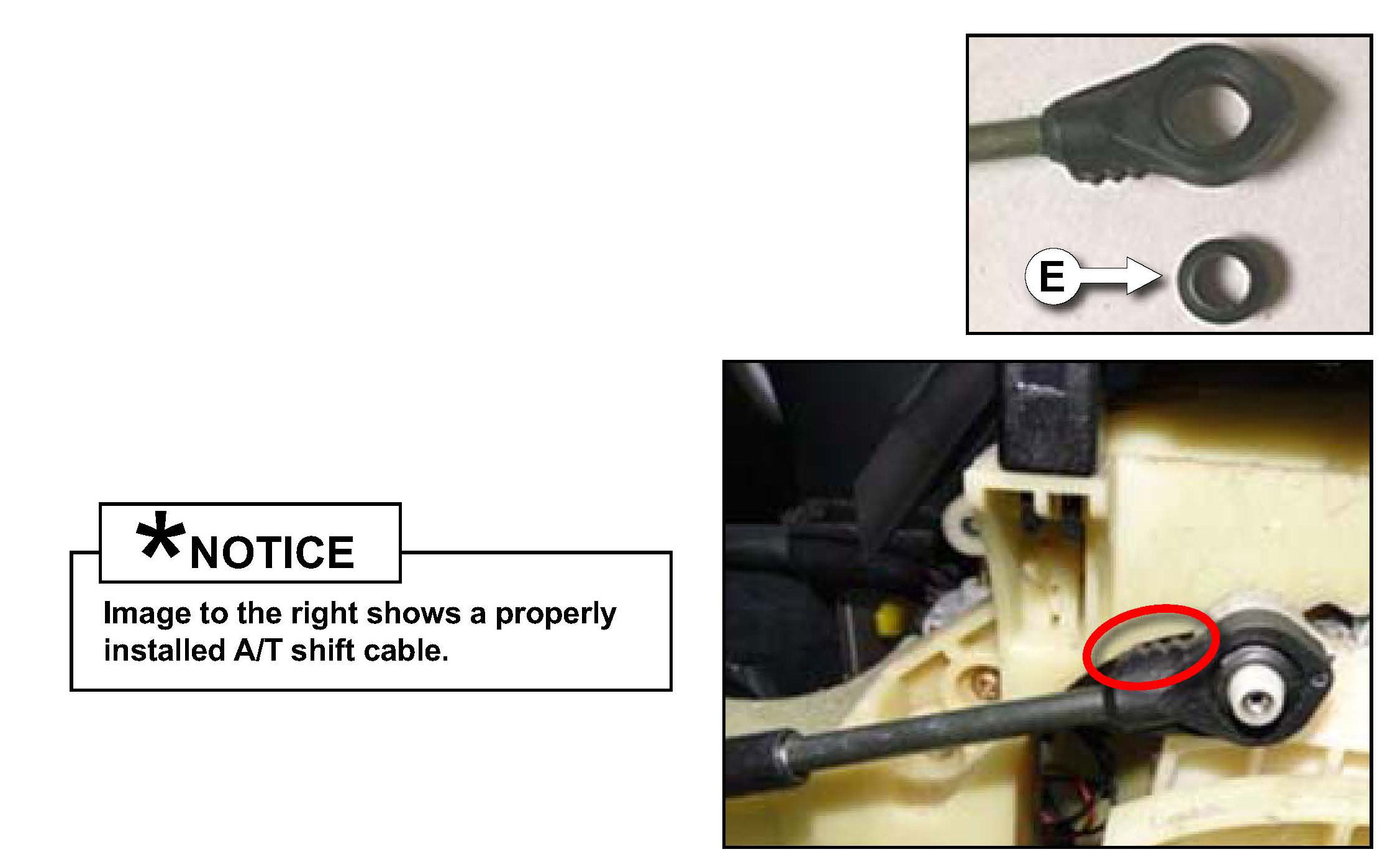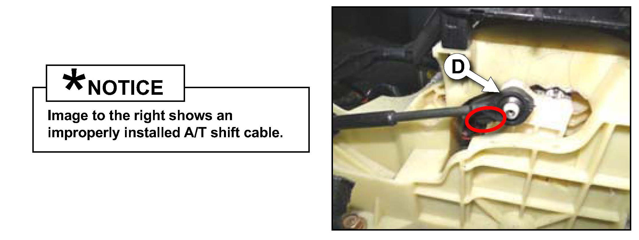 This bulletin provides information relating to the inspection of the A/T shift cable on certain 2006-2008 model year Optima (MG) vehicles produced from September 29, 2005 through June 13, 2007. Some of these vehicles may have the A/T shift cable installed incorrectly causing tension in the cable. This condition could cause the cable to detach from the shifter assembly's dowel pin preventing the transmission from being shifted. If the A/T shift cable is found to be installed incorrectly the A/T shift cable bushing will need to be replaced before reinstalling the shift cable in the correct position.