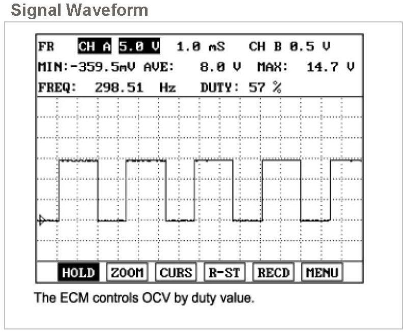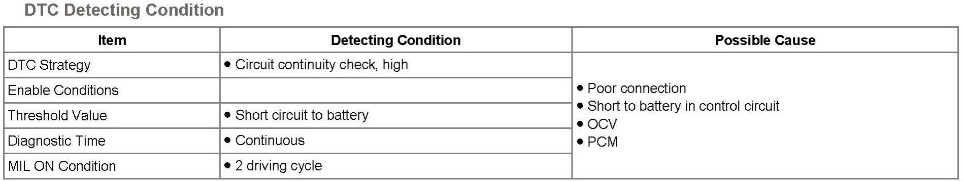 When ECM detects short to power in OCV control circuit, ECM sets DTC P0077.