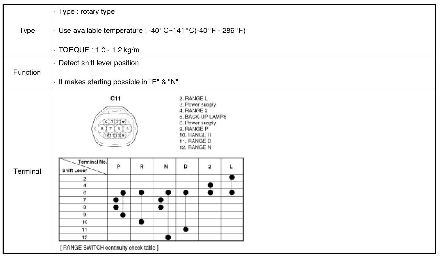 By shifting the selector to the "P" or "N" range, the electrical circuit inside the inhibitor switch is connected to form the ignition circuit with which the engine can be started. When the shift is in the "R" range, the backup lamp lights up as backup lamp circuit is energized.
