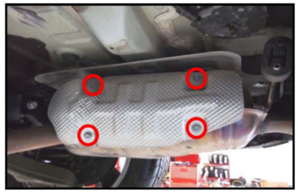 Remove the muffler shielding by removing the four (4) 10 mm bolts as indicated in the circles.