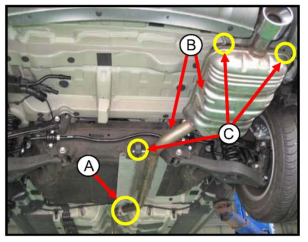 3. Remove the two (2) 19 mm flange nuts (A) and then remove muffler and pipe assembly (B) from the three (3) donut hangers (C).