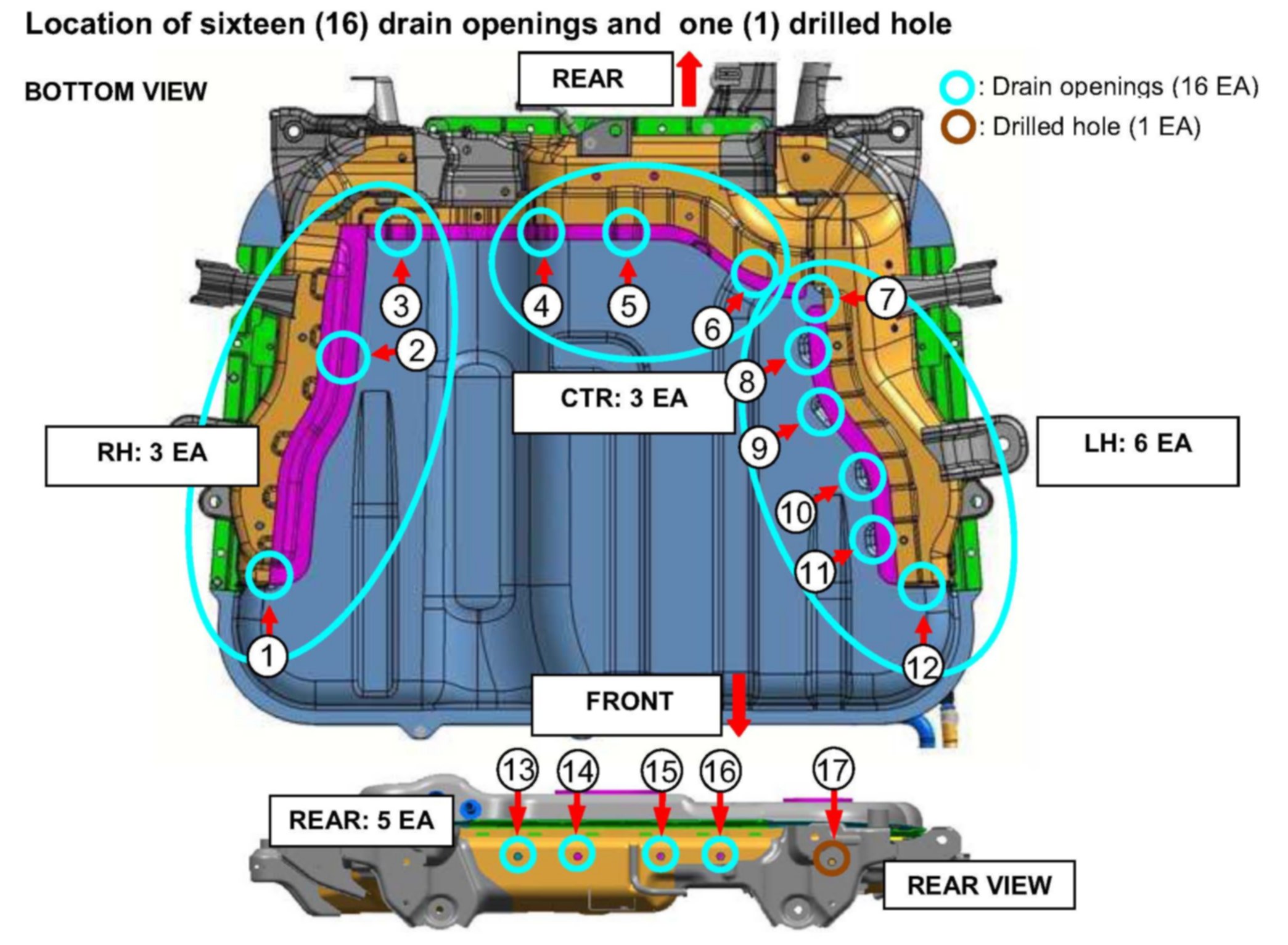 20. Spray cavity wax through three (3) rear openings (13, 16 and 17).