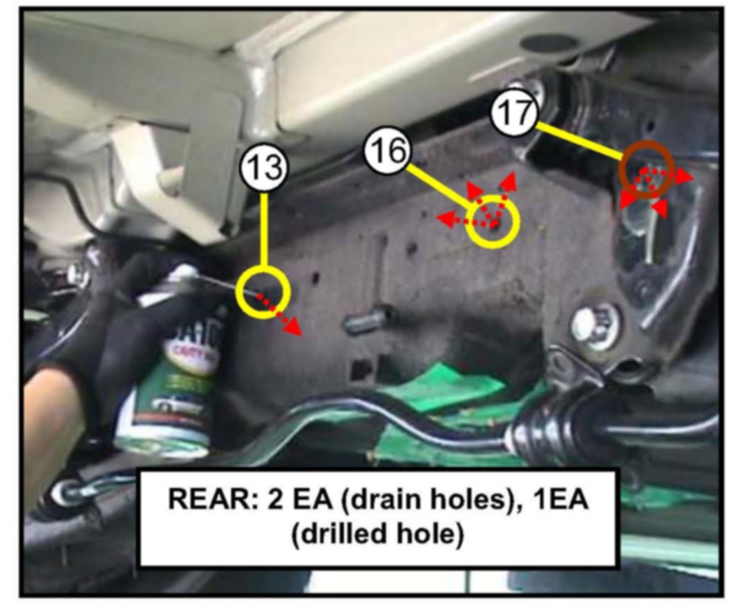 16. Spray cavity wax through the twelve (12) holes indicated in the photo above. Three (3) cavity wax aerosol cans are required to perform this task per vehicle, so use one (1) can of cavity wax per four (4) openings.