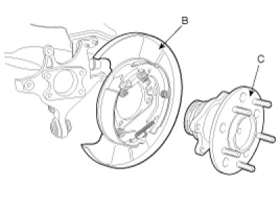 1. Install the rear hub assembly (C) and rear brake assembly (B) to the rear carrier, then tighten mounting bolts (A).