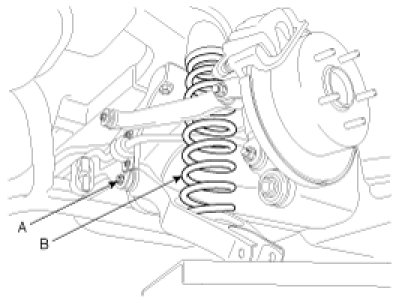 5. Loosen the mounting nut (A) of the cross member and the rear lower arm, then remove the coil spring (B) by taking down the jack.