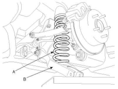 9. Install the coil spring (A) on the rear lower arm (B), then slowly jack-up the rear lower arm (B) by using jack.